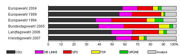 | Kreistagswahl 2007 | 39,6 | 52,8 | 12,3 | 5,5 | 4,3 | 1,8 | 23,2 | |