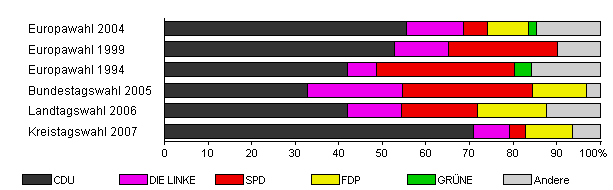| Europawahl 2004 | 68,8 | 55,6 | 13,0 | 5,6 | 9,3 | 1,9 | 14,8 | |