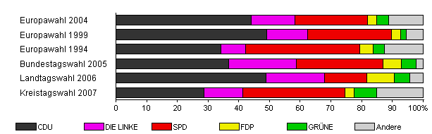 | Kreistagswahl 2007 | 33,4 | 28,8 | 12,6 | 33,3 | 2,9 | 7,4 | 14,9 | |