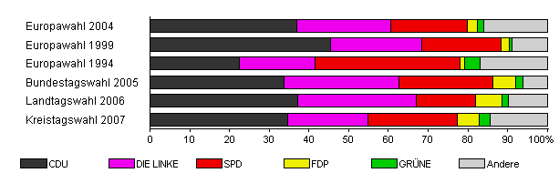 | Landtagswahl 2006 | 58,6 | 37,2 | 29,8 | 14,9 | 6,6 | 1,7 | 9,9 | |