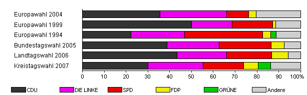 | Landtagswahl 2006 | 55,2 | 43,4 | 22,6 | 20,8 | 7,5 | - | 5,7 | |