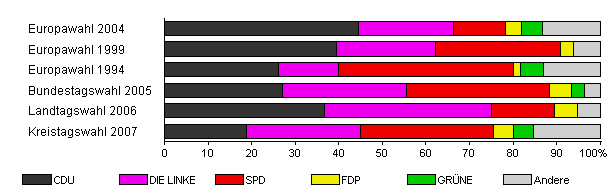 | Kreistagswahl 2007 | 50,0 | 18,9 | 26,0 | 30,6 | 4,6 | 4,6 | 15,3 | |