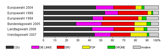 | Kreistagswahl 2007 | 39,4 | 44,2 | 14,2 | 17,2 | 14,5 | 1,6 | 8,3 | |