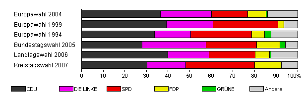 | Kreistagswahl 2007 | 40,4 | 30,4 | 17,7 | 32,0 | 12,1 | 0,2 | 7,6 | |