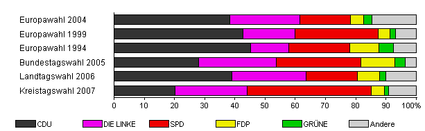 | Landtagswahl 2006 | 40,9 | 39,1 | 24,4 | 17,1 | 7,3 | 2,2 | 9,8 | |