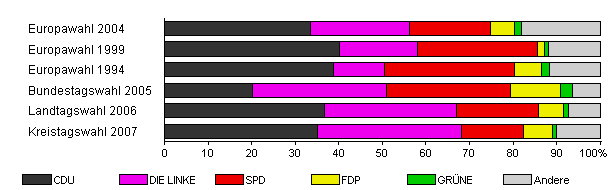 | Kreistagswahl 2007 | 37,5 | 35,2 | 32,9 | 14,2 | 6,8 | 0,8 | 10,2 | |