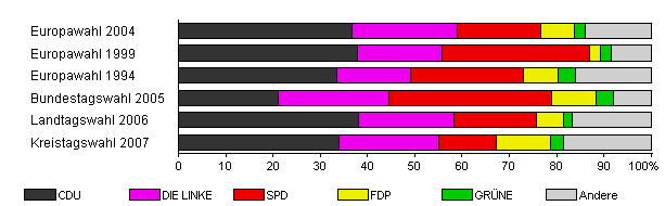 | Kreistagswahl 2007 | 41,7 | 33,9 | 21,1 | 12,3 | 11,4 | 2,7 | 18,6 | |