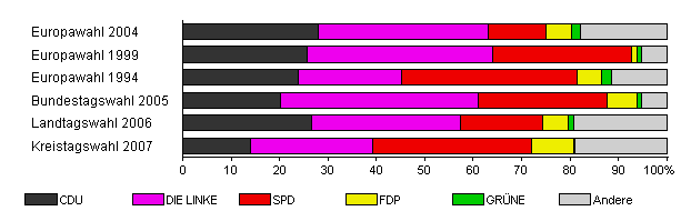 | Kreistagswahl 2007 | 44,9 | 14,0 | 25,2 | 32,8 | 8,9 | 0,2 | 19,0 | |