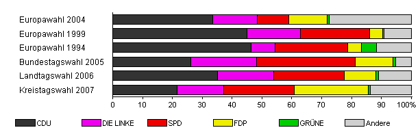 | Landtagswahl 2006 | 43,6 | 35,1 | 18,8 | 23,8 | 10,4 | 1,0 | 10,9 | |