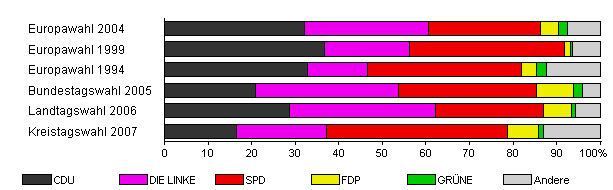 | Kreistagswahl 2007 | 42,3 | 16,6 | 20,5 | 41,6 | 7,2 | 1,0 | 13,1 | |