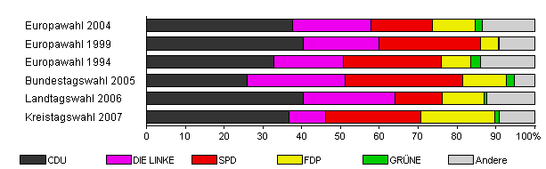 | Kreistagswahl 2007 | 29,6 | 36,8 | 9,3 | 24,7 | 18,9 | 1,3 | 9,1 | |