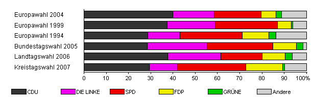 | Kreistagswahl 2007 | 34,0 | 29,3 | 12,8 | 30,7 | 16,6 | 0,9 | 9,7 | |