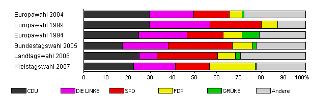 | Landtagswahl 2006 | 52,7 | 25,0 | 8,0 | 27,3 | 8,0 | 2,3 | 29,5 | |