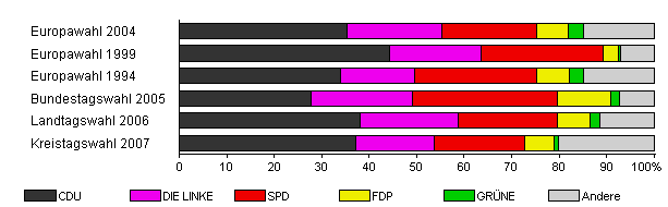 | Kreistagswahl 2007 | 26,1 | 37,3 | 16,4 | 19,0 | 6,3 | 0,8 | 20,2 | |