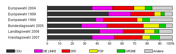 | Kreistagswahl 2007 | 23,6 | 35,8 | 17,9 | 22,3 | 6,3 | 7,4 | 10,3 | |