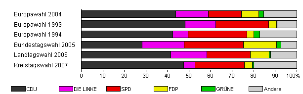| Kreistagswahl 2007 | 41,2 | 47,5 | 5,2 | 23,0 | 3,8 | 0,6 | 19,8 | |