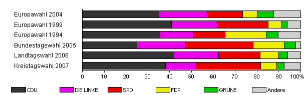 | Kreistagswahl 2007 | 37,5 | 38,0 | 14,0 | 29,7 | 7,3 | 3,4 | 7,7 | |
