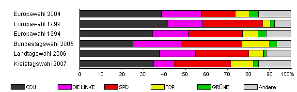 | Kreistagswahl 2007 | 25,7 | 34,9 | 9,8 | 26,9 | 10,5 | 2,7 | 15,3 | |
