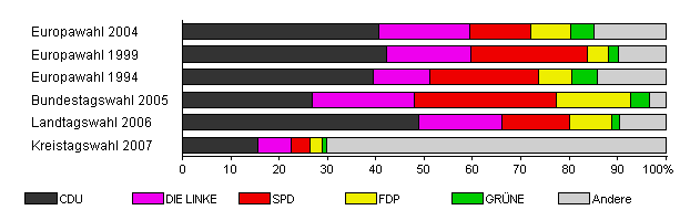 | Kreistagswahl 2007 | 49,4 | 15,5 | 7,1 | 3,8 | 2,5 | 0,9 | 70,1 | |