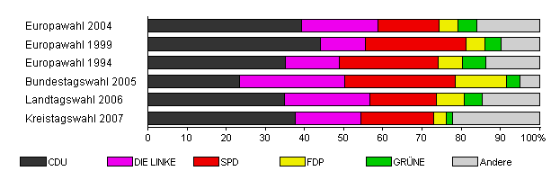 | Landtagswahl 2006 | 44,5 | 35,0 | 21,7 | 16,9 | 7,1 | 4,7 | 14,6 | |