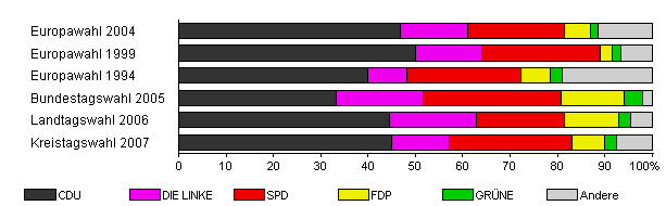 | Kreistagswahl 2007 | 33,8 | 45,0 | 12,2 | 26,0 | 6,7 | 2,6 | 7,5 | |