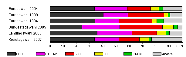 | Landtagswahl 2006 | 33,6 | 35,8 | 26,1 | 18,8 | 7,2 | 2,6 | 9,6 | |