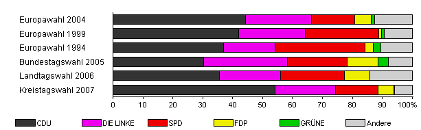 | Kreistagswahl 2007 | 29,0 | 54,2 | 20,1 | 14,3 | 5,3 | 0,3 | 5,8 | |