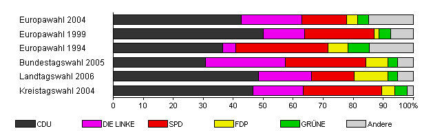 | Landtagswahl 2006 | 41,4 | 48,5 | 17,5 | 14,4 | 11,3 | 3,1 | 5,2 | |