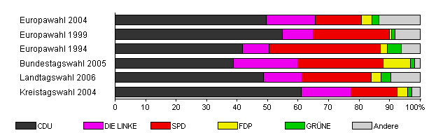 | Kreistagswahl 2004 | 61,5 | 61,1 | 16,3 | 15,1 | 3,5 | 1,4 | 2,6 | |