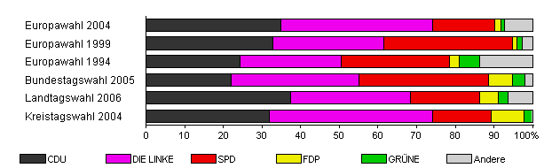 | Landtagswahl 2006 | 41,4 | 37,4 | 31,1 | 17,9 | 4,7 | 2,6 | 6,3 | |