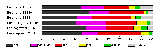 | Kreistagswahl 2004 | 55,3 | 36,6 | 14,3 | 38,8 | 7,2 | 2,2 | 0,8 | |