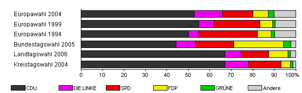 | Kreistagswahl 2004 | 69,5 | 67,1 | 11,0 | 15,2 | 4,2 | 1,3 | 1,3 | |