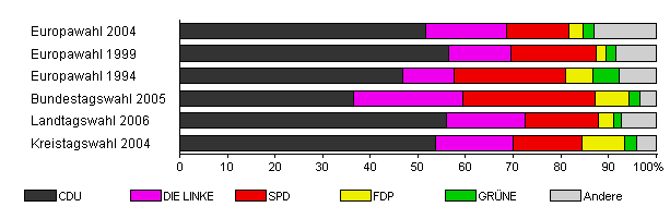 | Landtagswahl 2006 | 52,4 | 56,0 | 16,5 | 15,4 | 3,3 | 1,6 | 7,1 | |