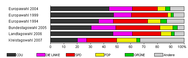 | Kreistagswahl 2007 | 39,1 | 20,3 | 6,7 | 22,6 | 15,0 | 2,4 | 33,1 | |