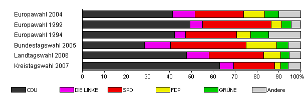 | Kreistagswahl 2007 | 51,5 | 62,9 | 6,5 | 18,7 | 2,8 | 3,4 | 5,7 | |