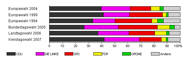 | Landtagswahl 2006 | 41,3 | 37,1 | 23,8 | 19,7 | 8,9 | 2,2 | 8,4 | |