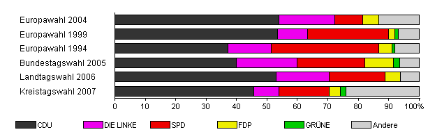 | Kreistagswahl 2007 | 46,9 | 45,6 | 8,3 | 16,6 | 3,6 | 1,8 | 24,3 | |