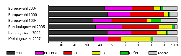 | Kreistagswahl 2007 | 54,0 | 34,9 | 11,3 | 10,1 | 23,2 | 1,7 | 18,7 | |