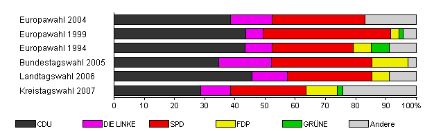 | Kreistagswahl 2007 | 64,8 | 28,7 | 9,9 | 24,9 | 10,5 | 1,7 | 24,3 | |