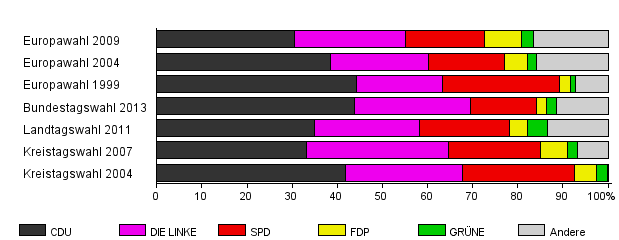 | Bundestagswahl 2013 | 55,1 | 43,7 | 25,7 | 14,8 | 2,1 | 2,2 | 11,3 | |