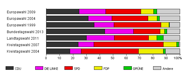| Bundestagswahl 2013 | 55,7 | 43,8 | 21,4 | 20,1 | 3,3 | 1,8 | 9,7 | |