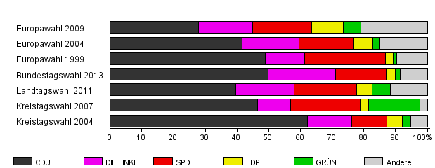 | Kreistagswahl 2004 | 46,5 | 62,3 | 13,8 | 11,1 | 4,9 | 2,6 | 5,3 | |