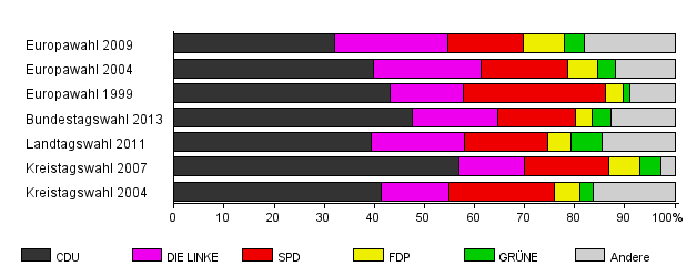 | Bundestagswahl 2013 | 57,8 | 47,6 | 17,1 | 15,5 | 3,2 | 3,8 | 12,8 | |