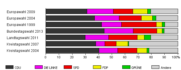 | Bundestagswahl 2013 | 58,0 | 44,2 | 22,0 | 17,9 | 4,0 | 1,6 | 10,3 | |