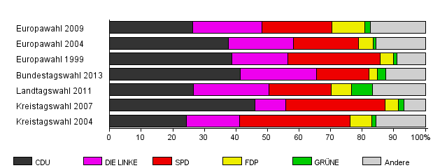 | Bundestagswahl 2013 | 51,9 | 41,4 | 24,1 | 16,6 | 2,7 | 2,7 | 12,5 | |