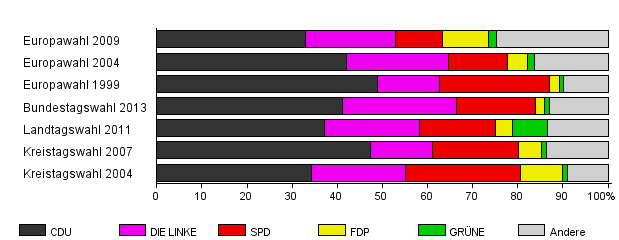 | Landtagswahl 2011 | 52,0 | 37,2 | 21,0 | 16,8 | 3,8 | 7,7 | 13,5 | |