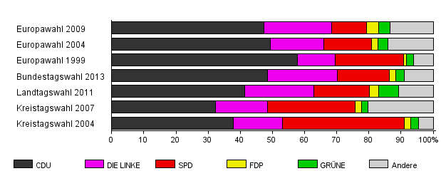 | Bundestagswahl 2013 | 54,4 | 48,4 | 21,7 | 16,2 | 2,1 | 2,5 | 9,1 | |
