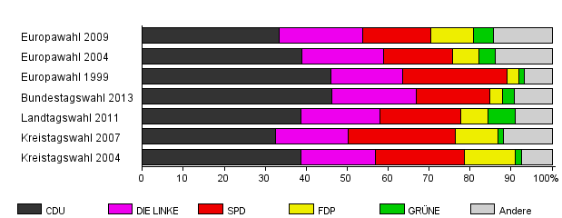 | Bundestagswahl 2013 | 60,9 | 46,2 | 20,7 | 17,9 | 3,2 | 2,8 | 9,2 | |