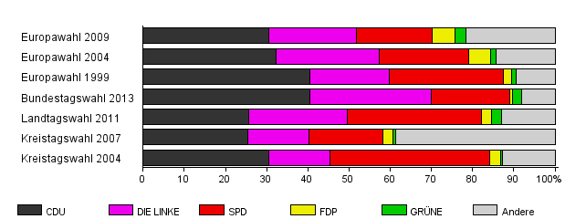 | Bundestagswahl 2013 | 50,0 | 40,4 | 29,6 | 18,9 | 0,8 | 2,1 | 8,2 | |