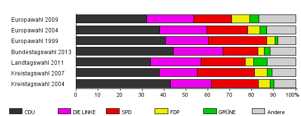 | Bundestagswahl 2013 | 51,9 | 44,3 | 22,5 | 16,0 | 2,8 | 2,8 | 11,6 | |